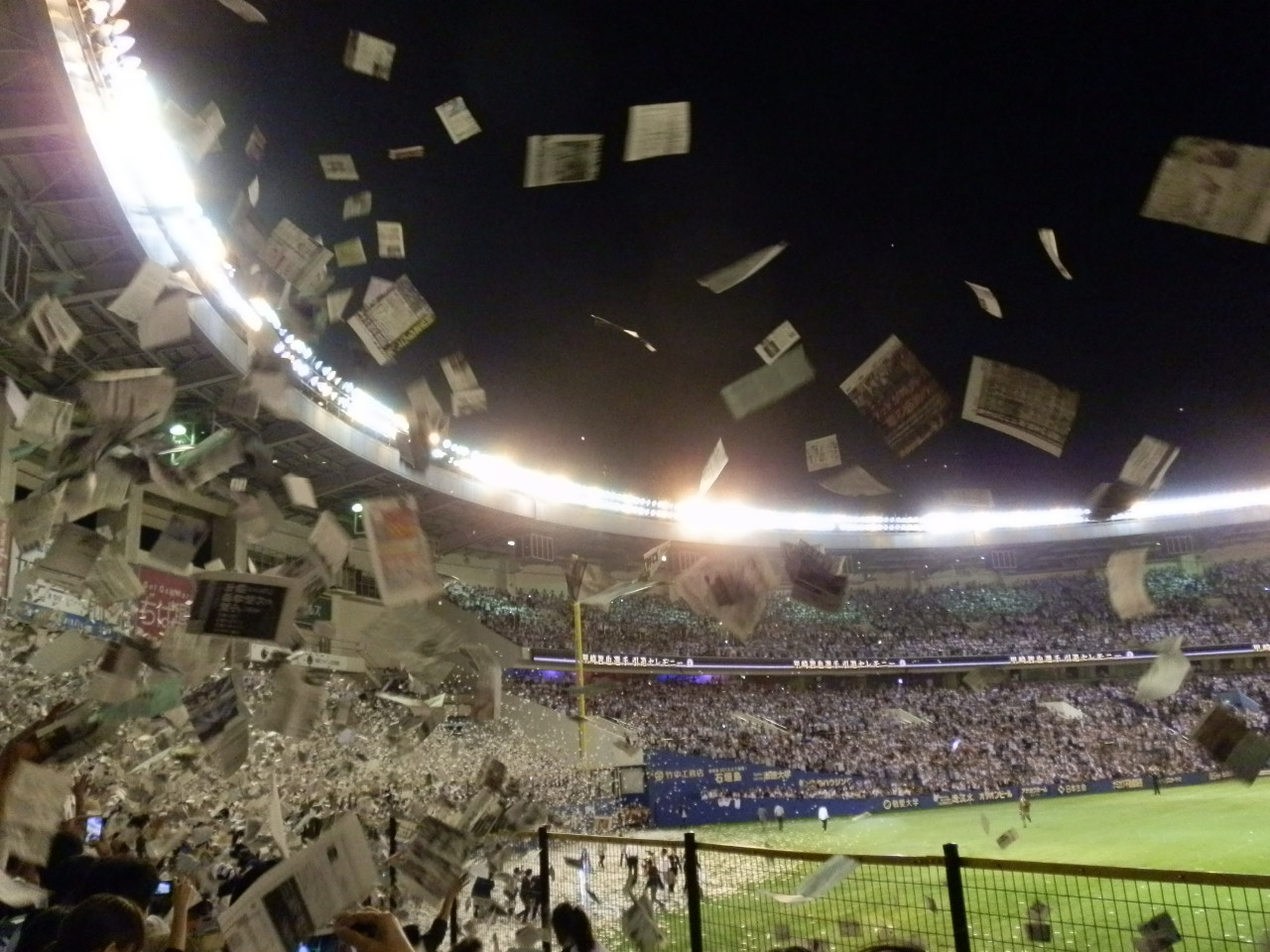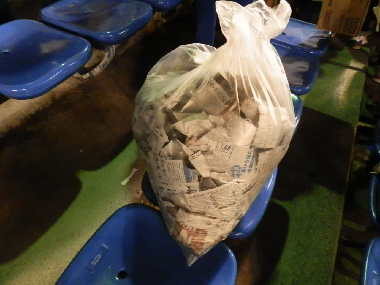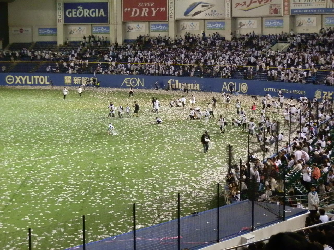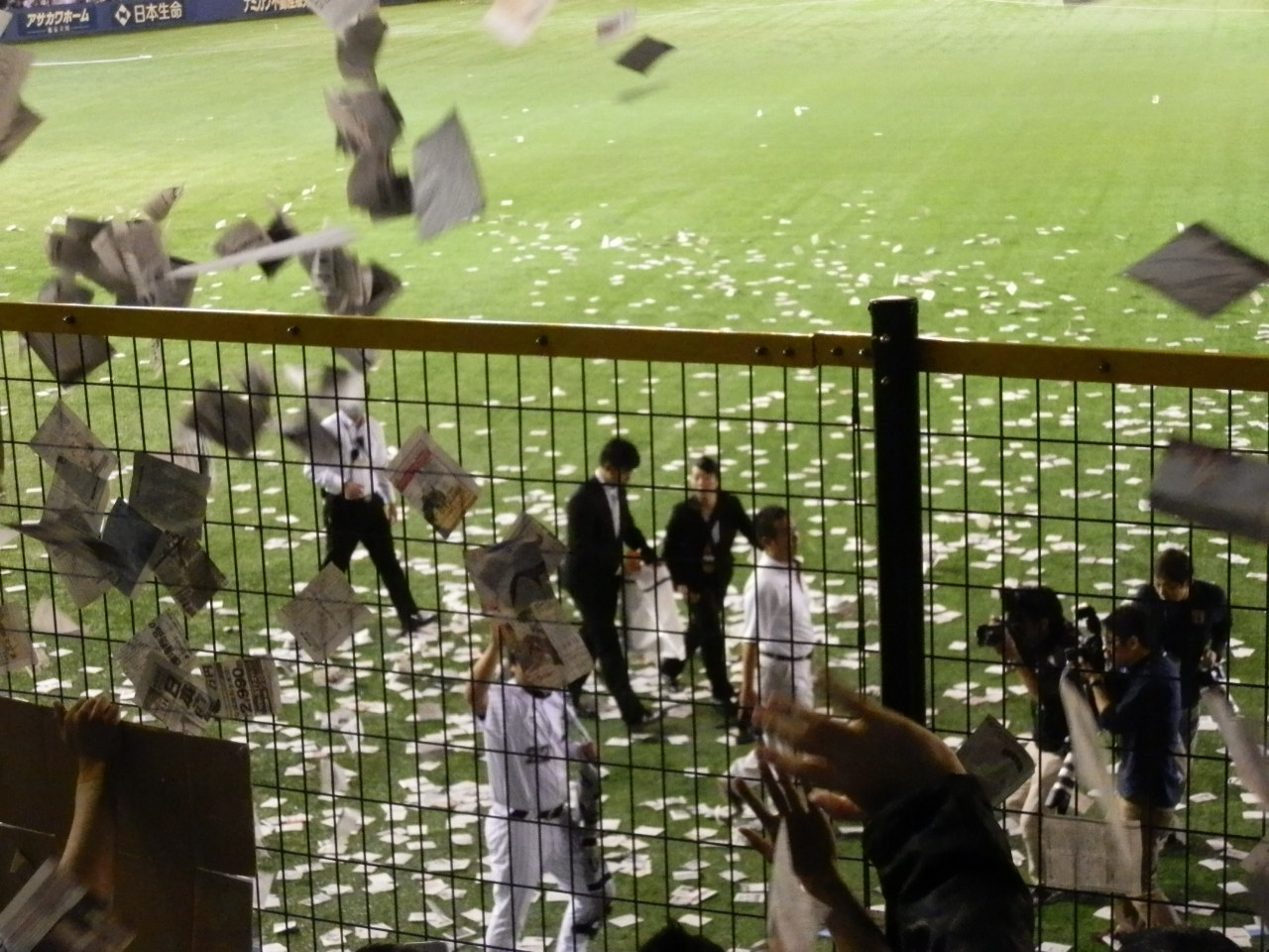 ←グラウンドに散った紙ふぶきを回収に向かうファン