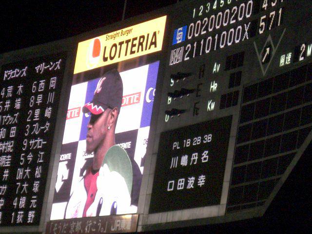 レフトのベンちゃんが完全に見失い落球をかますと中日野手陣がチンタラやる間に竹原一気にホームイン。ランニングホームランとなってリードを広げる。