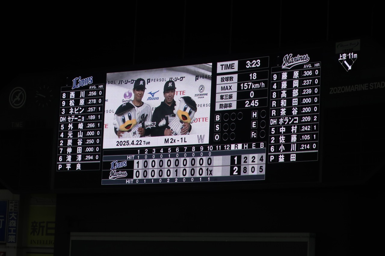 例によってあと1本が出ない展開だったが延長10回に中村のプロ初サヨナラヒットで連敗ストップ