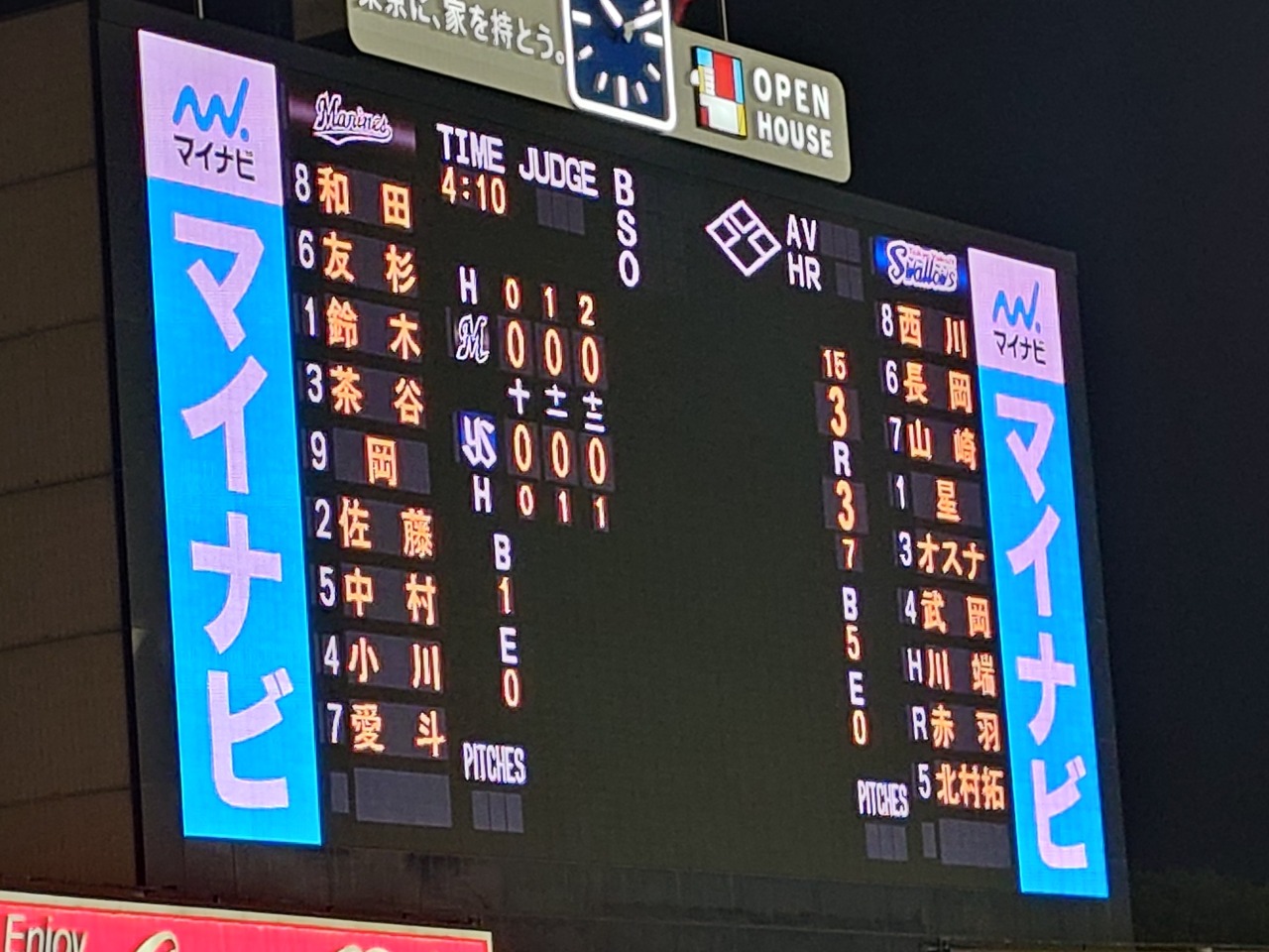 打線はいきなり中村の第1号で幕を開けましたがそれ以降は例によってなかなか点が入らなかったです。